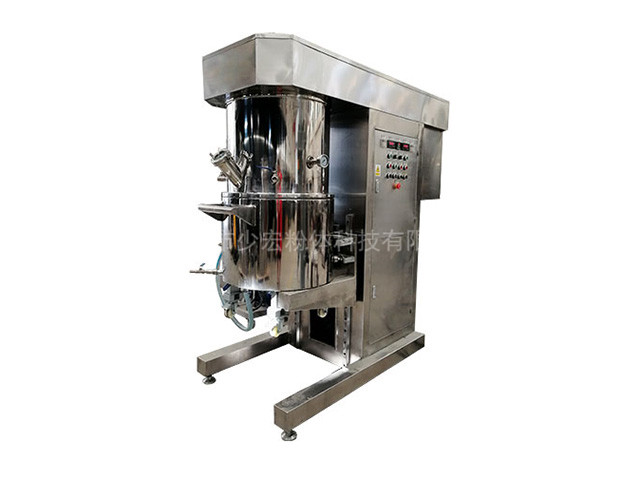 行星分散攪拌機有高速、低速、活動刮板作攪拌、剪切、刮壁、溶解用。低速運轉(zhuǎn)的攪拌錨使物料在密閉容器內(nèi)上下翻動、剪切和混合,高速運轉(zhuǎn)的齒形分散盤與混合的物料產(chǎn)生強烈的碰擊和剪切,隨著攪拌錨的旋轉(zhuǎn),行星架上的活動刮刀隨著旋轉(zhuǎn),把釜體上的物料完全刮掉,使聚集物完全、徹底地達到混合、分散、溶解的要求。在其高低速的不同作用下,使物料能夠達到均勻的混合和分散。
